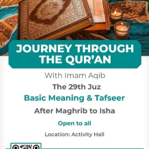 With Imam AqibThe 29th JuzBasic Meaning & Tafseer ๐ After Maghrib to Isha โจ Open to all ๐ Location: Activity Hall ๐ Register here: Click to Register