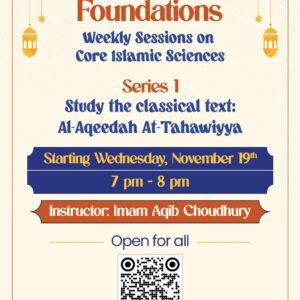 Series 1 Study the classical text: Al-Aqeedah At-Tahawiyya ๐ Starting Wednesday, November 19th โฐ 7 pm โ 8 pm Instructor: Imam Aqib Choudhury Open for all Register Now
