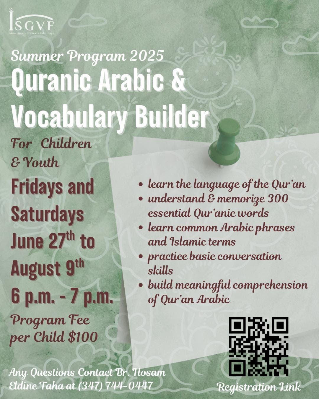 Join us for an engaging summer program designed to help children and youth learn the language of the Qur’an in a fun and meaningful way. This program will be held Fridays and Saturdays, from June 27th to August 9th, between 6:00 p.m. and 7:00 p.m.